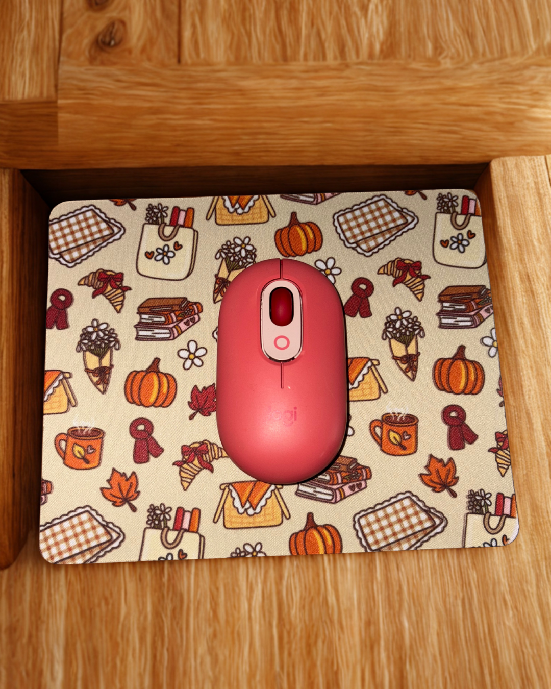 Cozy up your desk with our Bookish Fall Essentials Mouse Pad, featuring pumpkins, books, warm drinks, and autumn leaves in a charming illustrated pattern. Perfect for book lovers and fall enthusiasts alike.