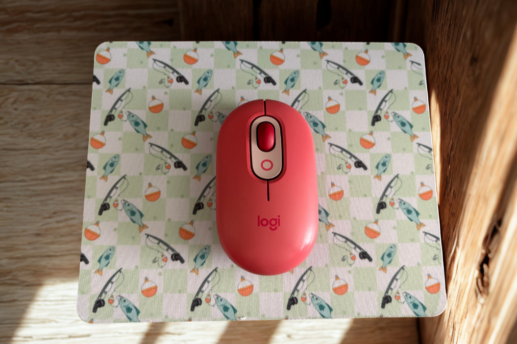 Bring the lake life to your workspace with this fishing-inspired mouse pad, decorated with detailed lures and floats over a soft green check pattern.