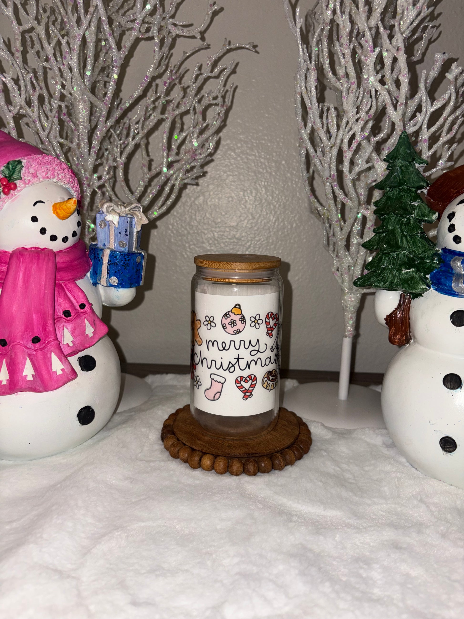 Add festive cheer to every sip with our Merry Christmas 12oz glass cup. Featuring cute holiday doodles like gingerbread men, candy canes, stockings, and snowflakes, this cup is perfect for iced coffee and festive drinks