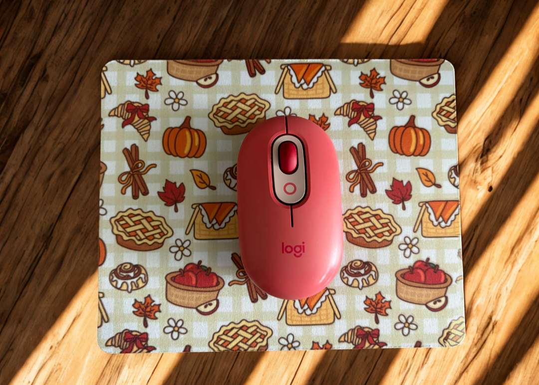 Celebrate the flavors of fall with this mouse pad patterned with pies, pumpkins, pastries, and seasonal leaves. A charming way to bring autumn to your workspace.